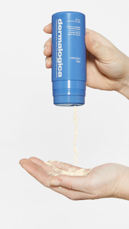On évite également les lotions exfoliantes trop concentrées en acides que les peaux sèches risquent de ne pas bien tolérer, sauf si la lotion possède des agents apaisants et hydratants. On privilégie donc un entre deux : la poudre exfoliante, qui possède de minuscules grains qui resurfacent la peau en douceur, mais qui possède également des acides afin de dissoudre les cellules mortes et de relancer le renouvellement cellulaire pour booster la luminosité du teint, stimuler la production d’acide hyaluronique et éliminer les rougeurs et desquamations.