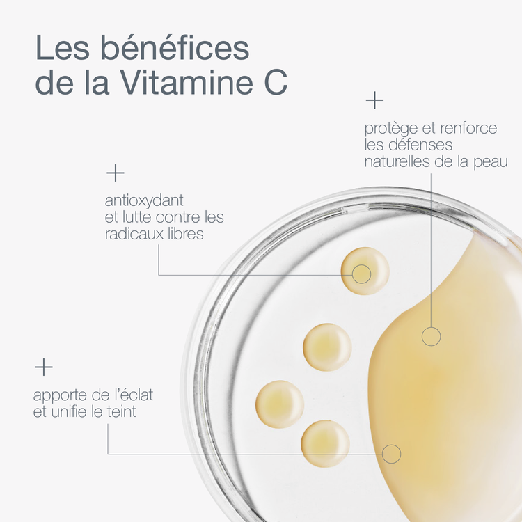 Ingrédient plébiscité pour ses vertus antioxydantes, la Vitamine C est un actif aux multiples bienfaits. Grâce à sa concentration élevée en antioxydants, elle protège la peau contre les agressions extérieures pouvant altérer son éclat et mener à son vieillissement prématuré.