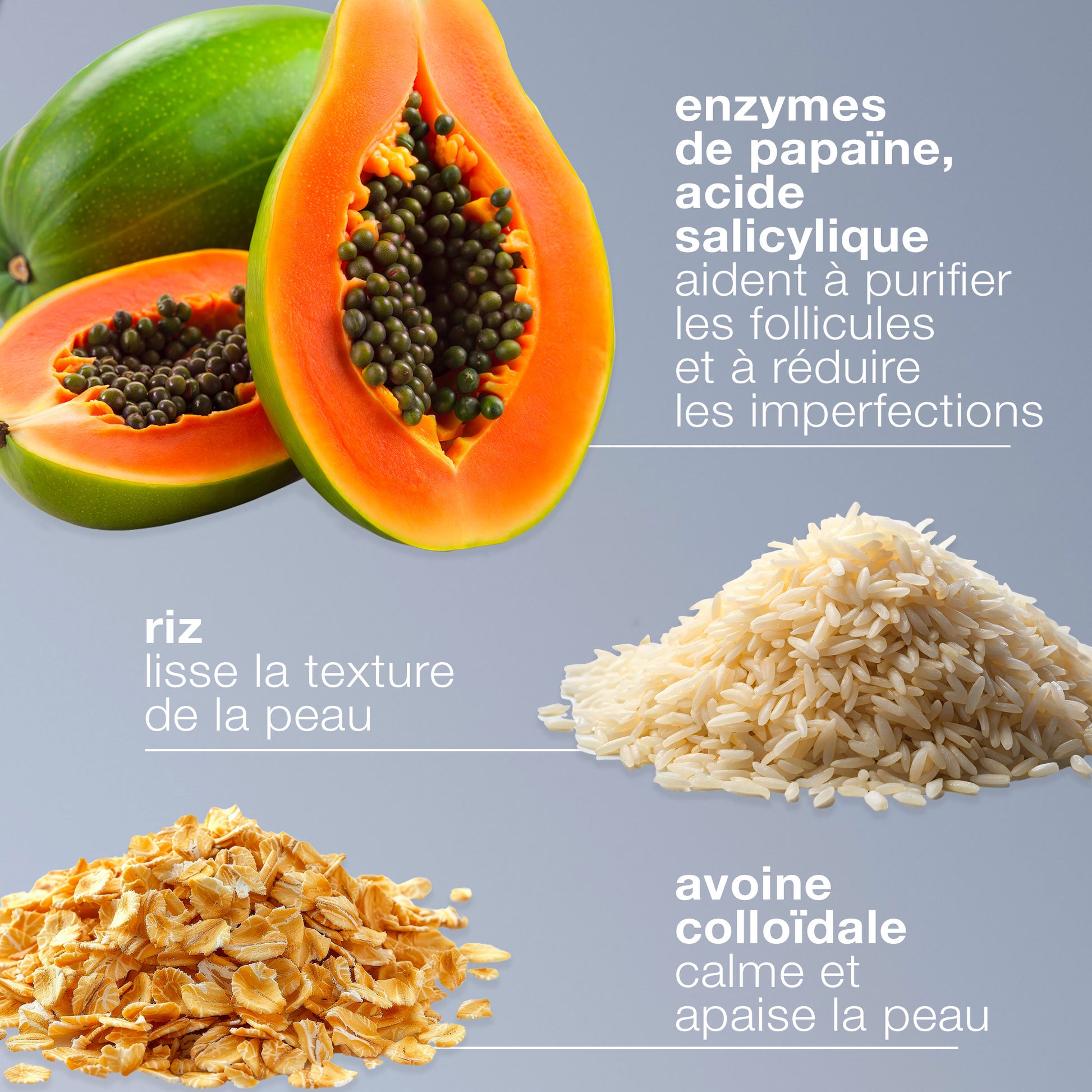 - Les enzymes de papaïne et l'acide salicylique aident à purifier les follicules et à réduire les imperfections.
